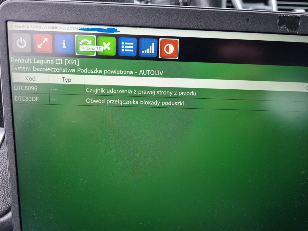 Moje spostrzeżenia dot. uszkodzenia nadwozia tego auta potwierdziły dane z mojego komputera diagnostycznego, a dokładnie sterownika systemu bezpieczeństwa, który wykazał błędy czujnika uderzenia prawej strony i obwodu blokady poduszki powietrznej.